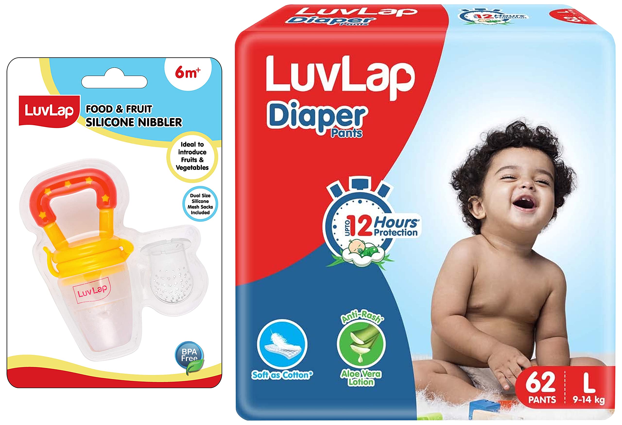 LuvLap Baby Diaper Pants L Size (Large) Pack of 62 Count & LuvLap Silicone Food/Fruit Nibbler