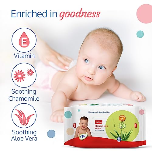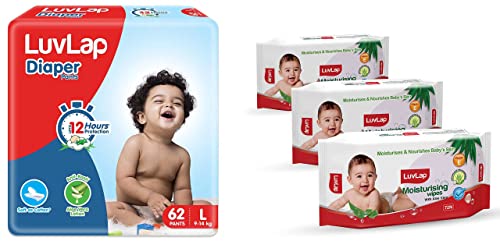 LuvLap Baby Diaper Pants L Size, with Aloe Vera Lotion for rash protection, Pack of 62 Count, with upto 12Hr protection For babies of 9 to 14Kg & Mositurising wipes for baby skin with Aloe Vera