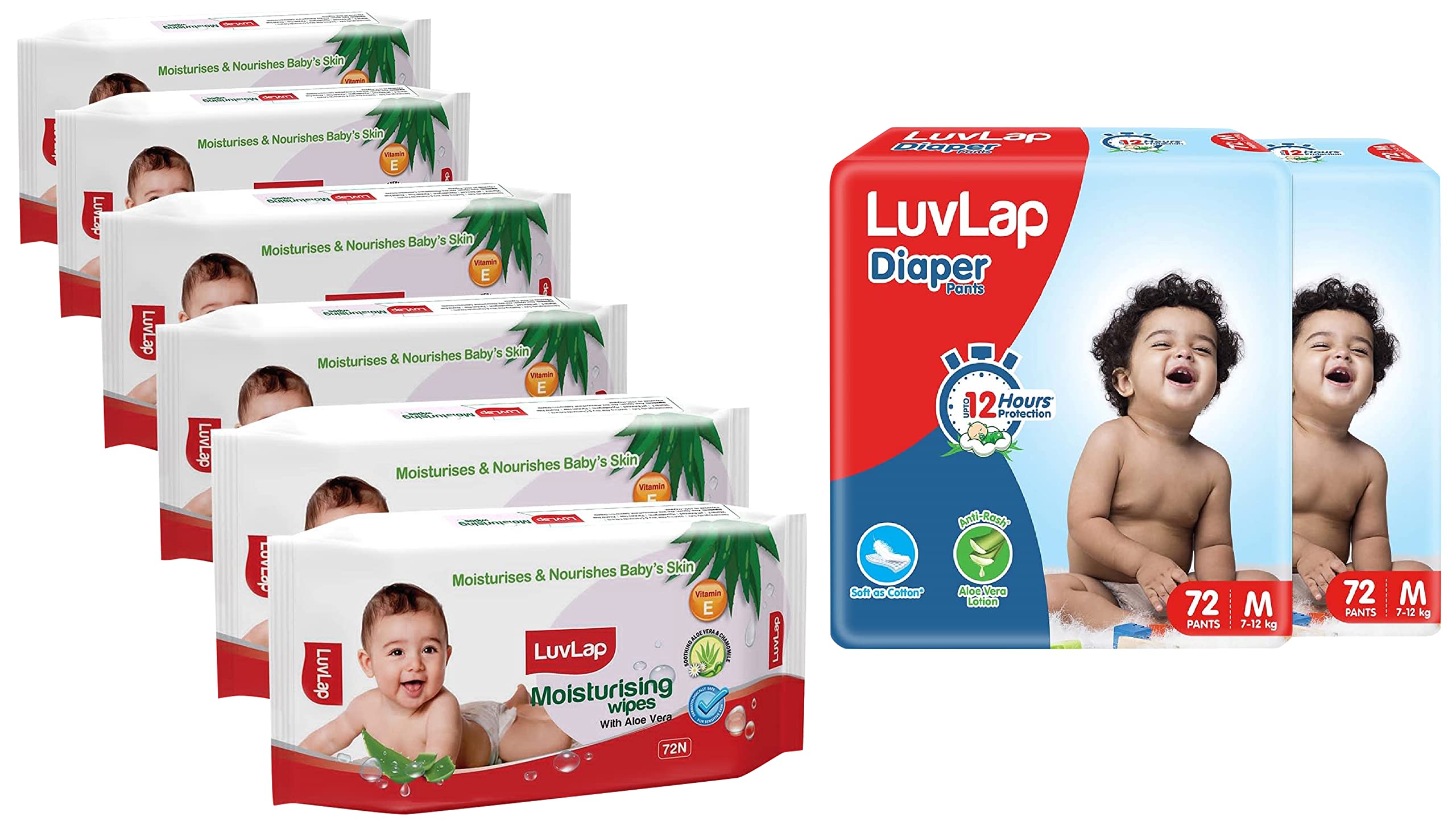 LuvLap Baby Diaper Pants M Size (Medium) Pack of 144 Count (72x2) Jumbo pack & LuvLap Paraben Free wipes for baby skin with Aloe Vera, 72 Wipes/Pack, 6 Packs