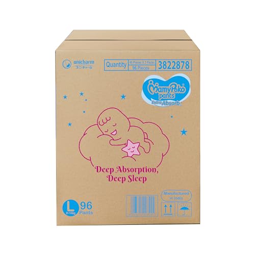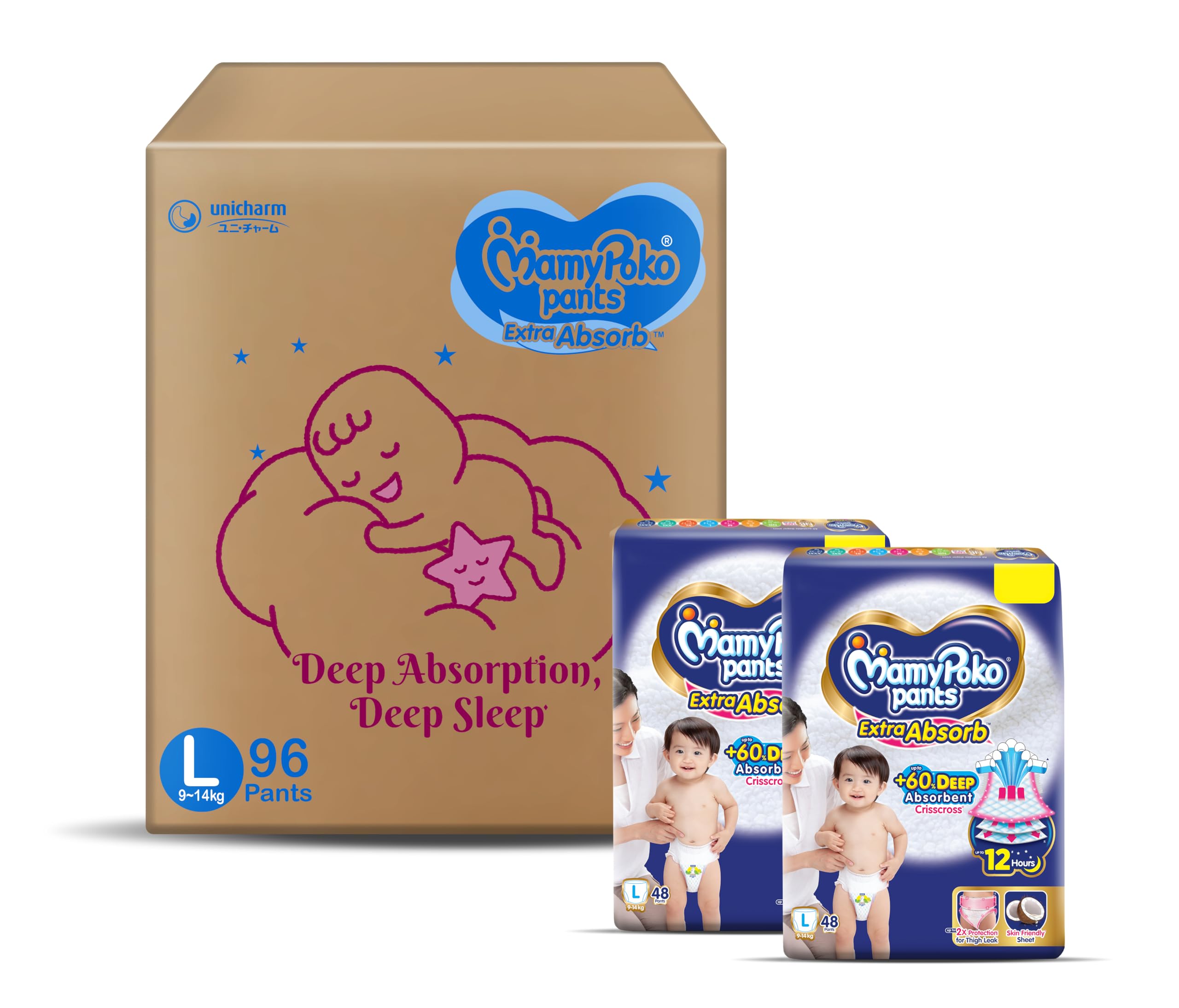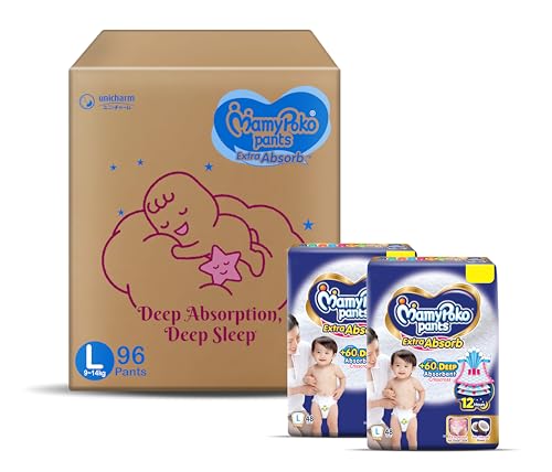 MamyPoko Pants Extra Absorb Baby Diapers, Large (L size) | 9-14 kg | 96 Count |Deep Sleep Diapers| Soft gentle fit |Deep Absorbent Crisscross | skin friendly with coconut oil |