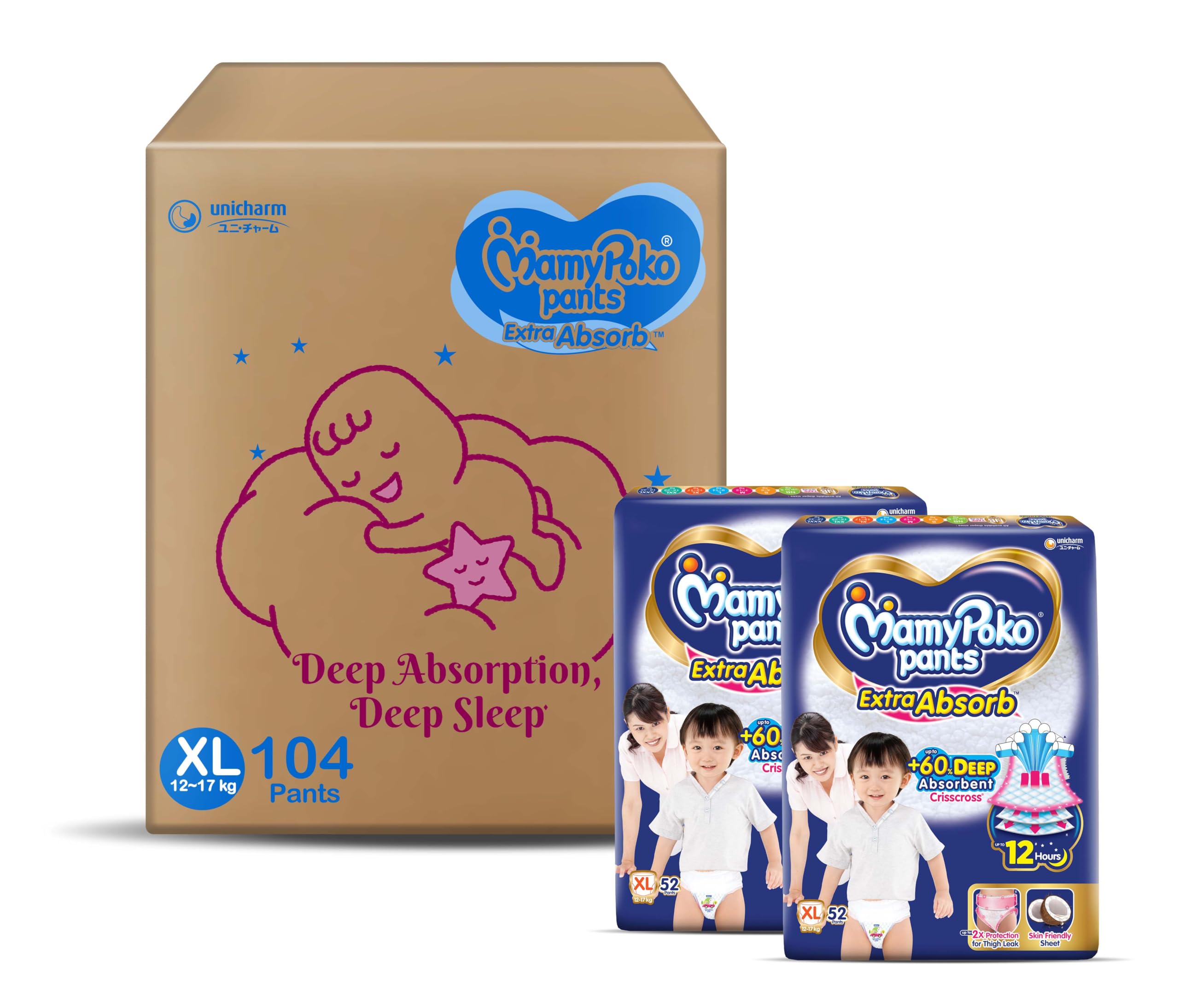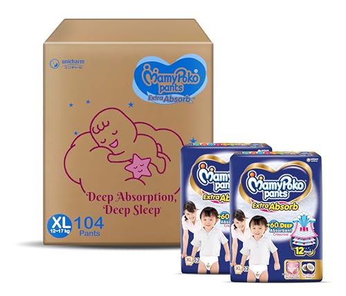 MamyPoko Pants Extra Absorb Baby Diapers, Extra Large (XL size) | 12-17 kg | 104 Count |Deep Sleep Diapers| Soft gentle fit |Deep Absorbent Crisscross | skin friendly with coconut oil |