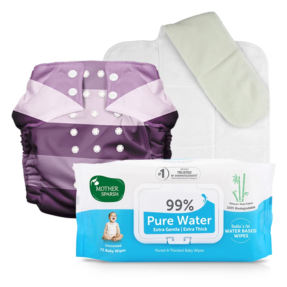 HomeBabyDiaperingBaby WipesMother Sparsh Plant Powered Cloth Diaper with FREE 99% Pure Water Baby Wipes (72Pcs) | Reusable Cloth Diaper for Babies with Built in Booster Pad (Little)| Unscented Baby Wipes