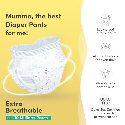 SOFT & COMFY - Mylos baby disposable diaper pants are soft as cotton & providecushioned touch against the babys bottom. Theyfit around the thighs perfectly are super stretchable and facilitate free movement making them super comfy.