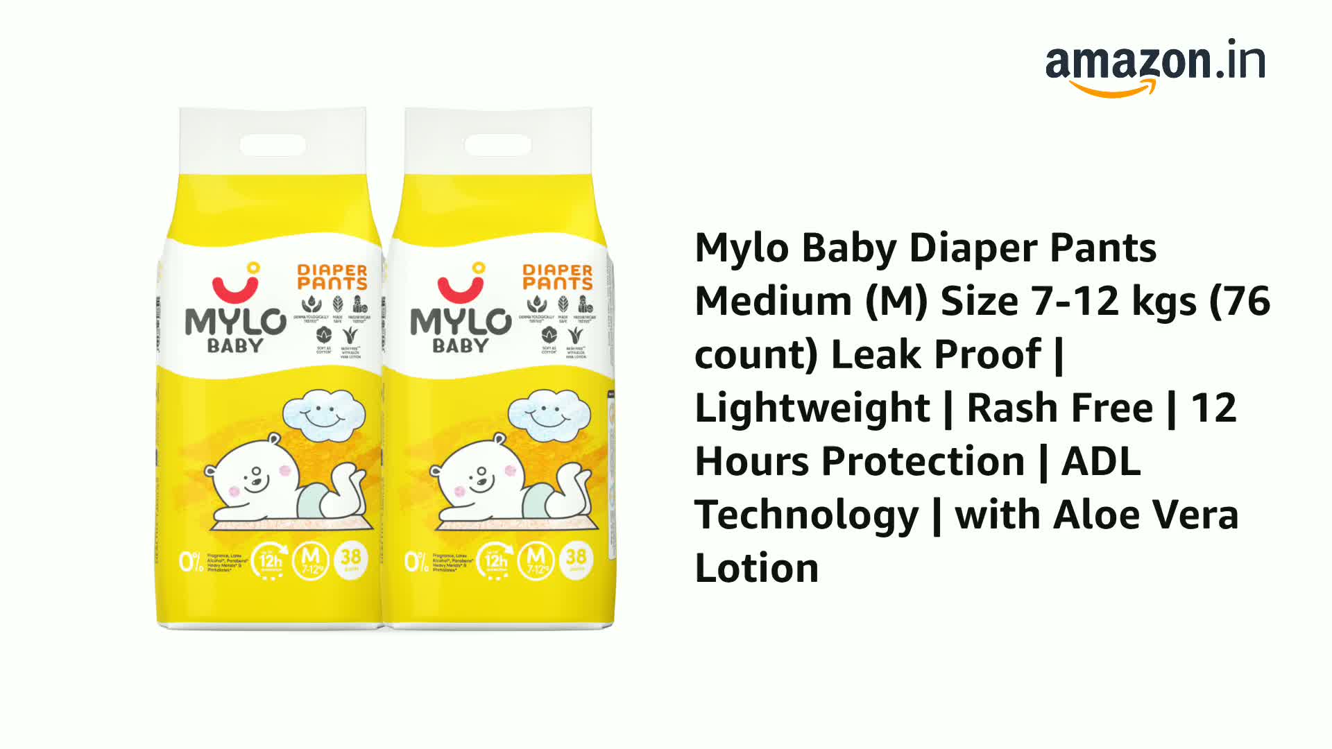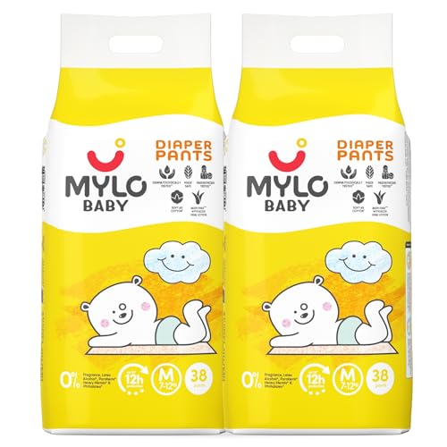 Mylo Baby Diaper Pants Medium (M) Size 7-12 kgs (76 count) Leak Proof | Lightweight | Rash Free | 12 Hours Protection | ADL Technology | with Aloe Vera Lotion