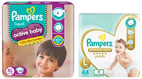Pampers Active Baby Taped Diapers, Extra Large size diapers, (XL) 56 count, taped style custom fit & Pampers Premium Care Pants, Large size baby diapers (LG), 44 Count, Softest ever Pampers pants