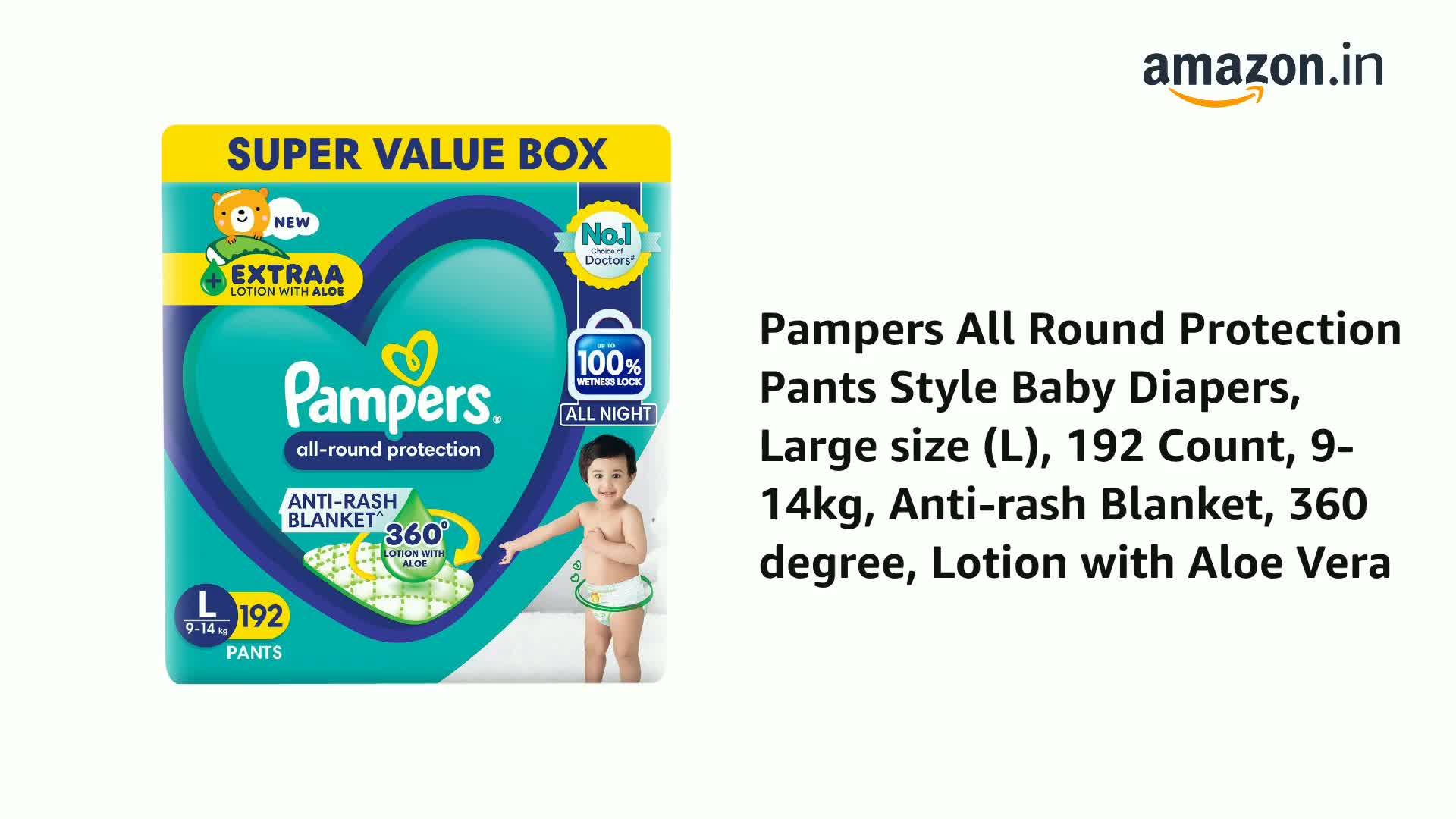 Pampers All Round Protection Pants Style Baby Diapers, Large size (L), 192 Count, 9-14kg, Anti-rash Blanket, 360 degree, Lotion with Aloe Vera