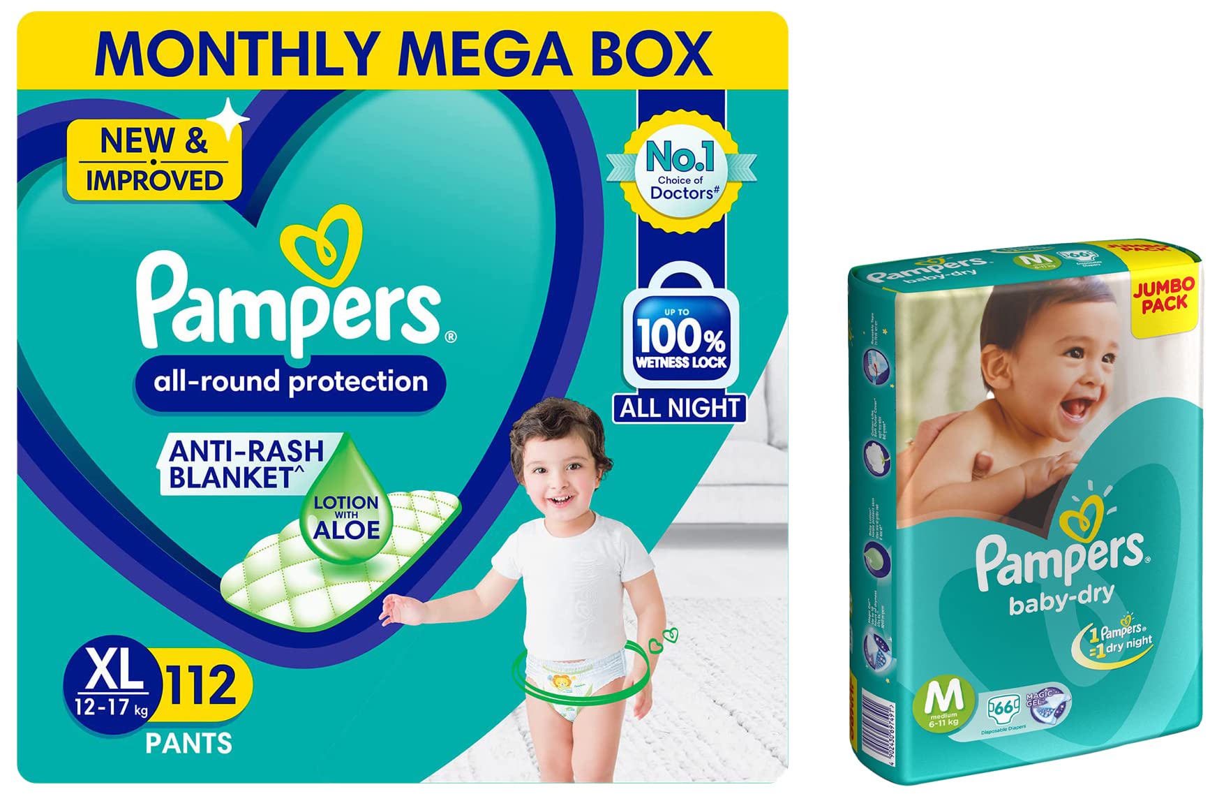 Pampers All round Protection Pants, Extra Large size baby Diapers, (XL) 112 Count Lotion with Aloe Vera & Pampers Taped Baby Diapers, Medium, (MD), 66 count