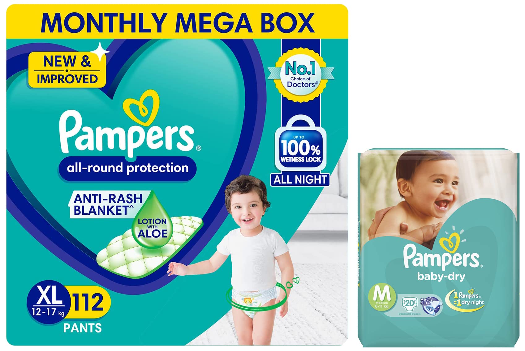 Pampers All round Protection Pants, Extra Large size baby Diapers, (XL) 112 Count Lotion with Aloe Vera & Pampers Taped Diapers Medium, (MD), 20 count