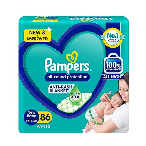 HomeBabyDiaperingBaby DiapersPampers All round Protection Pants New Born/Extra Small (NB/XS) Size 86 Count Pant Style Baby Diapers Anti Rash Blanket Lotion with Aloe Vera Up to 5kg Diapers