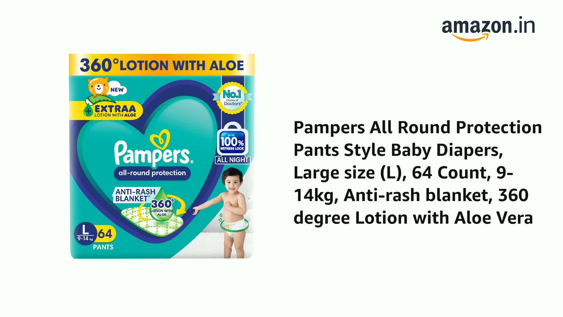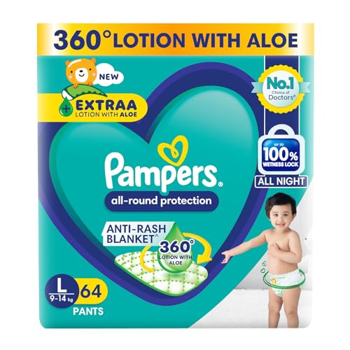Pampers All Round Protection Pants Style Baby Diapers, Large size (L), 64 Count, 9-14kg, Anti-rash blanket, 360 degree Lotion with Aloe Vera