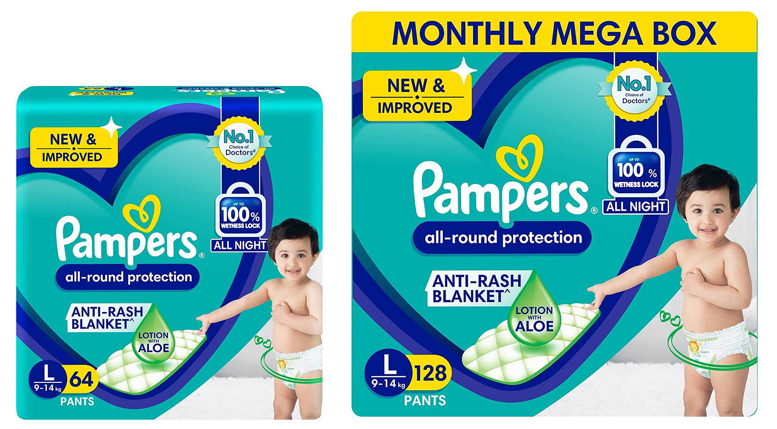 Pampers Unisex New Diapers Pants, Large (64 Count) & Pampers New Diapers Pants Monthly Box Pack, Large (Pack Of 128)