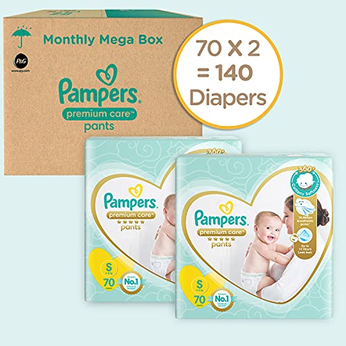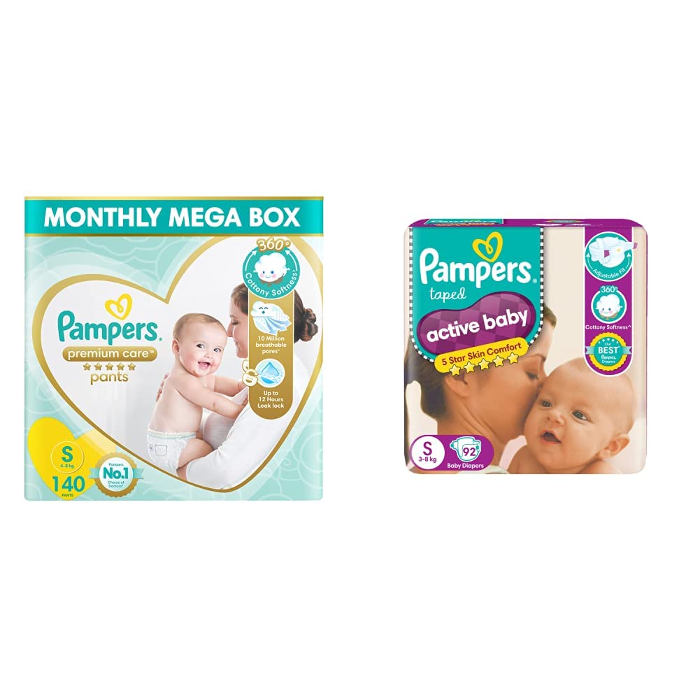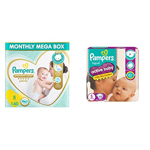 Pampers Premium Care Pants, Small size baby diapers (S), 140 Count, Softest ever Pampers pants & Pampers Active Baby Taped Diapers, Small size diapers, (S) 92 count, taped style custom fit