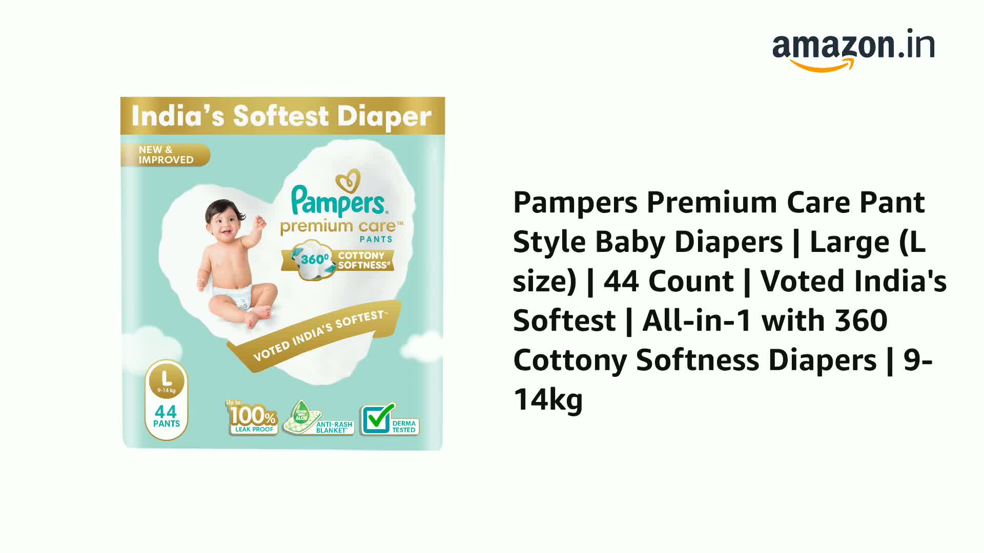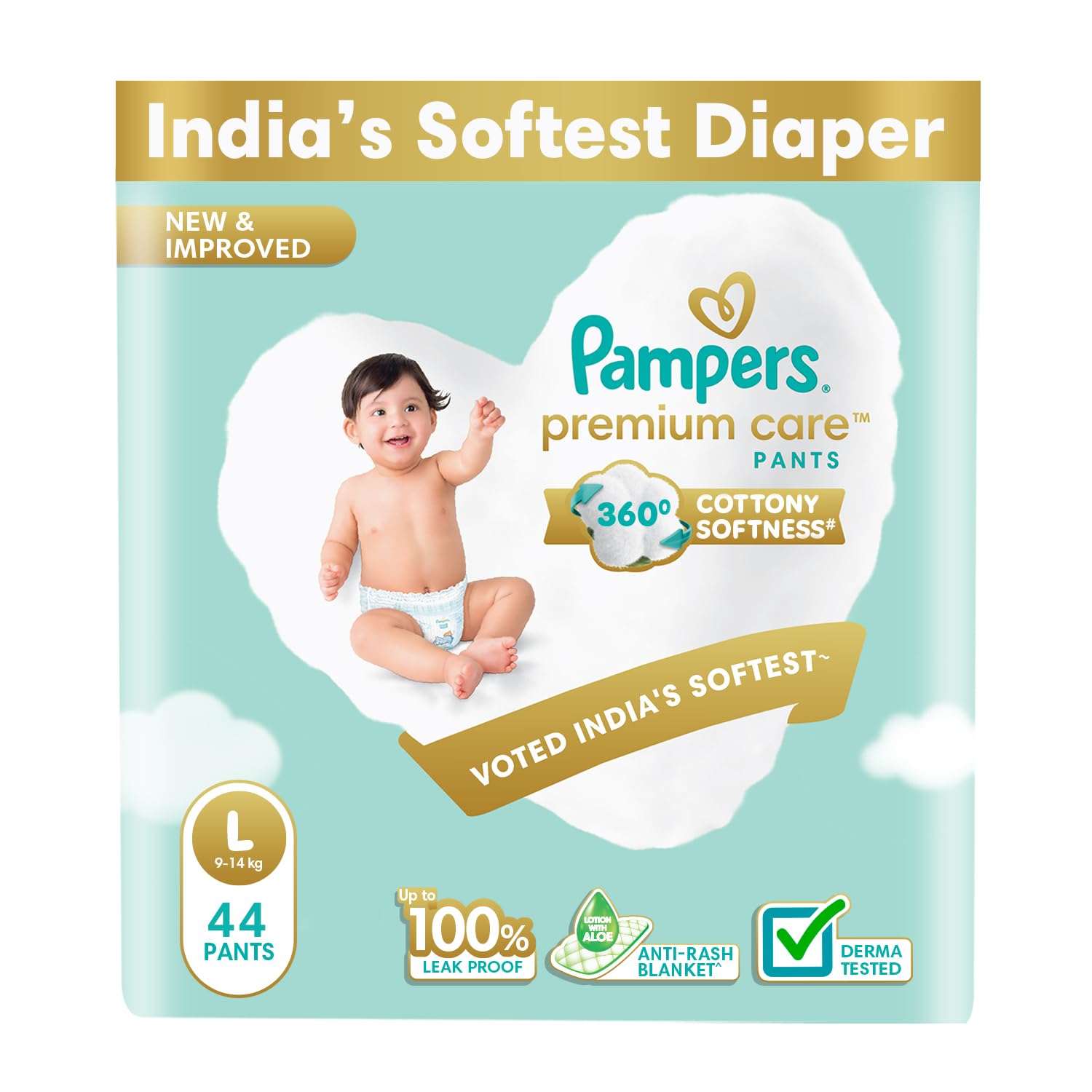 Pampers Premium Care Pant Style Baby Diapers | Large (L size) | 44 Count | Voted India's Softest | All-in-1 with 360 Cottony Softness Diapers | 9-14kg