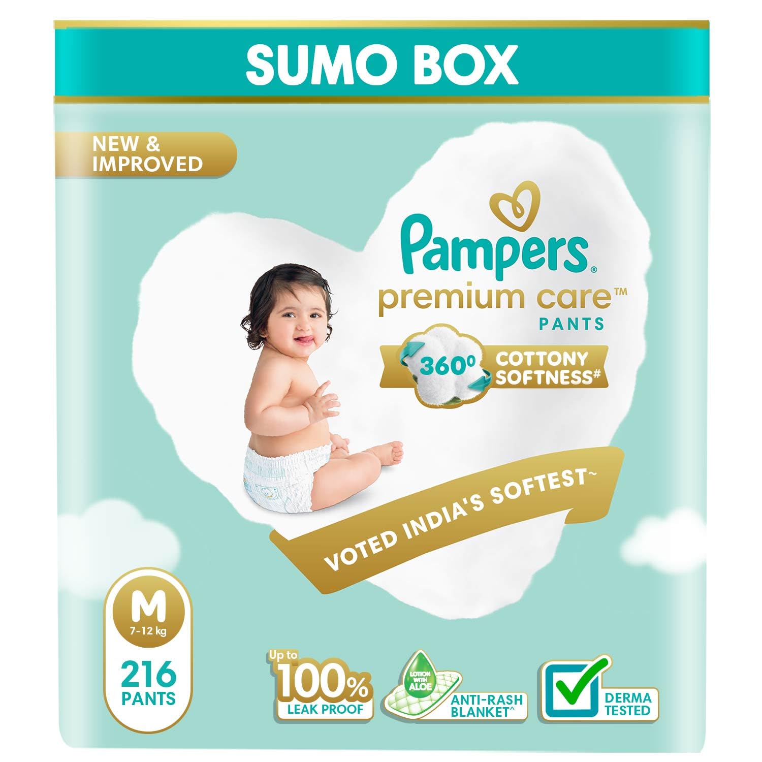 Pampers Premium Care Pant Style Baby Diapers, Medium (M size), 216 Count, 7-12kg, All-in-1 with 360 Cottony Softness Diapers
