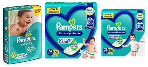Pampers Taped Baby Diapers, Medium, (MD), 66 count & All round Protection Pants (XL) 56 Count, Lotion with Aloe Vera & All round Protection Pants, Medium size baby diapers (M) 76 Count