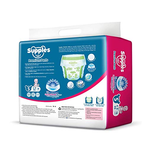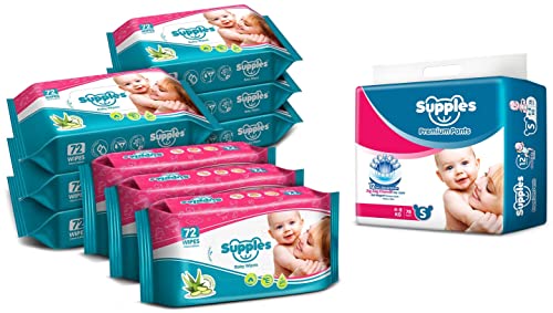 HomeBabyDiaperingBaby DiapersSupples Baby Wet Wipes with Aloe Vera and Vitamin E - 72 Wipes/Pack (Pack of 9) & Baby Pants Diapers, Small (4-8 kg), 78 Count