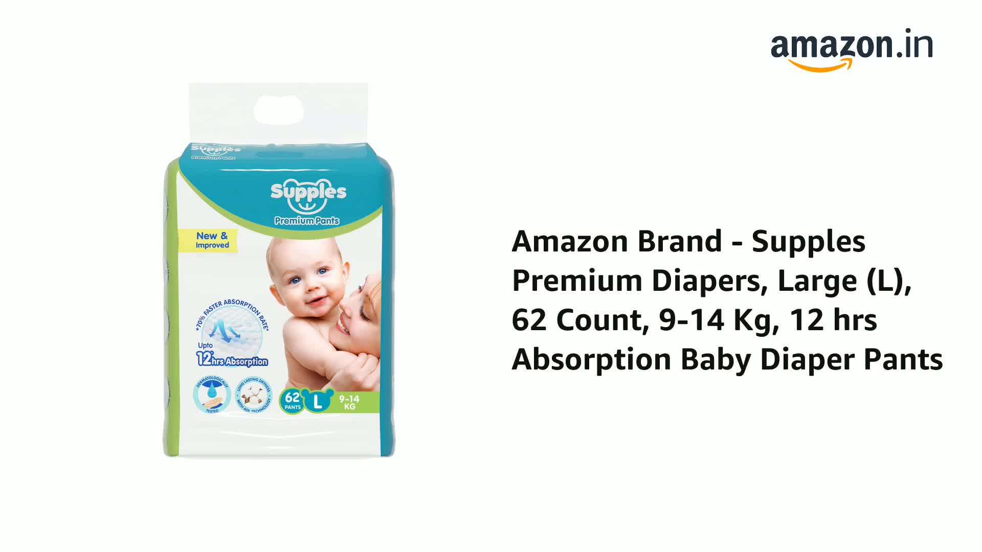 Amazon Brand - Supples Premium Baby Diaper Pants | 62 Baby Diapers | Large | 9-14 Kg | 12 Hrs Absorption | Cushiony Cotton Soft Fabric | Phthalates-Free | Triple Leak Guard