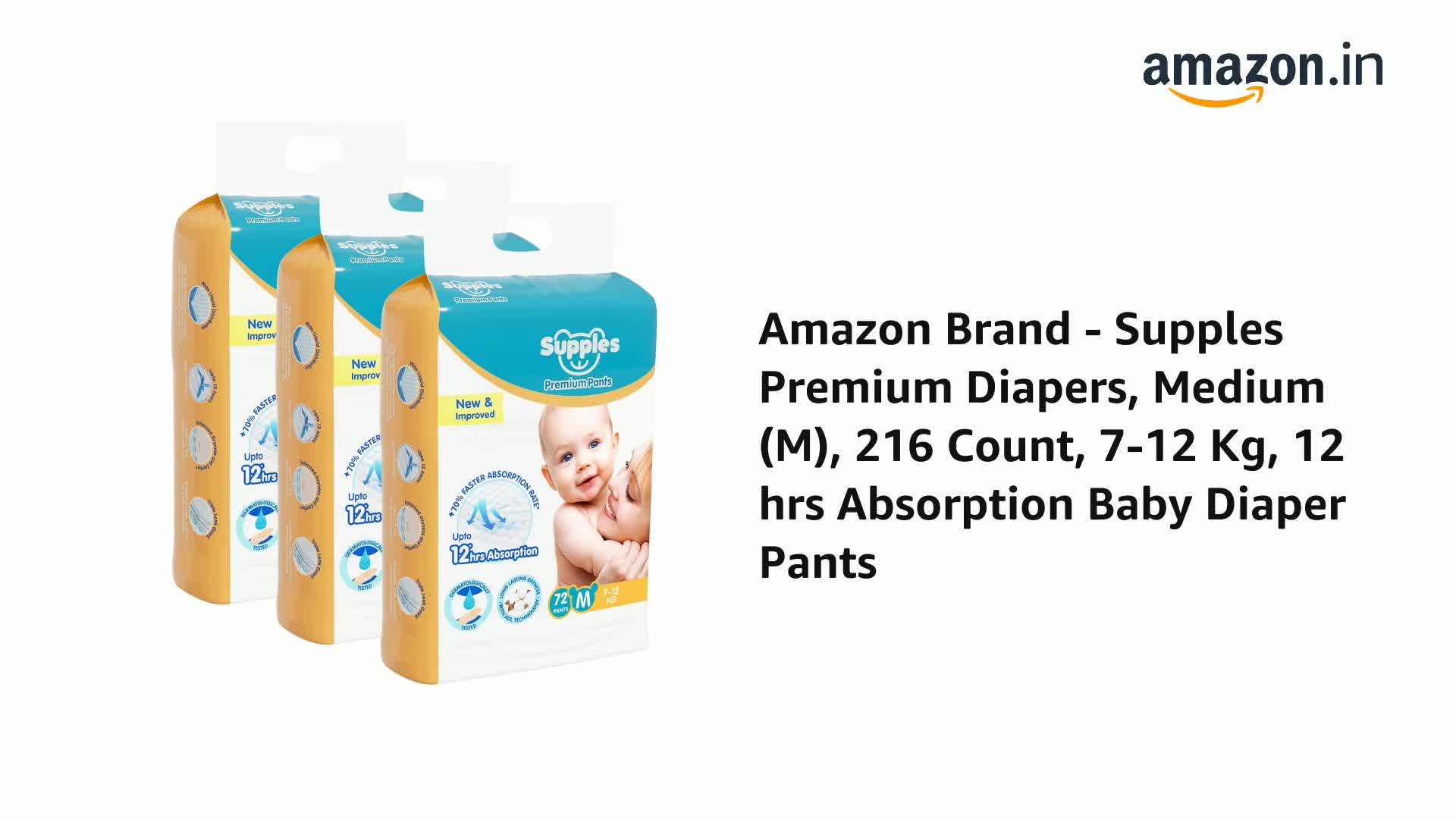 Amazon Brand - Supples Premium Baby Diaper Pants | 216 Baby Diapers | Medium | 7-12 Kg | 72 x 3 Packs | 12 Hrs Absorption | Cushiony Cotton Soft Fabric | Phthalates-Free | Triple Leak Guard