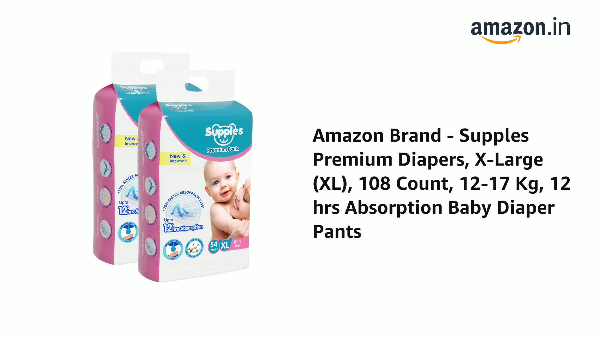 Amazon Brand - Supples Premium Baby Diaper Pants | 108 Baby Diapers | XL | 12-17 Kg | 54 x 2 Packs | 12 Hrs Absorption | Cushiony Cotton Soft Fabric | Phthalates-Free | Triple Leak Guard
