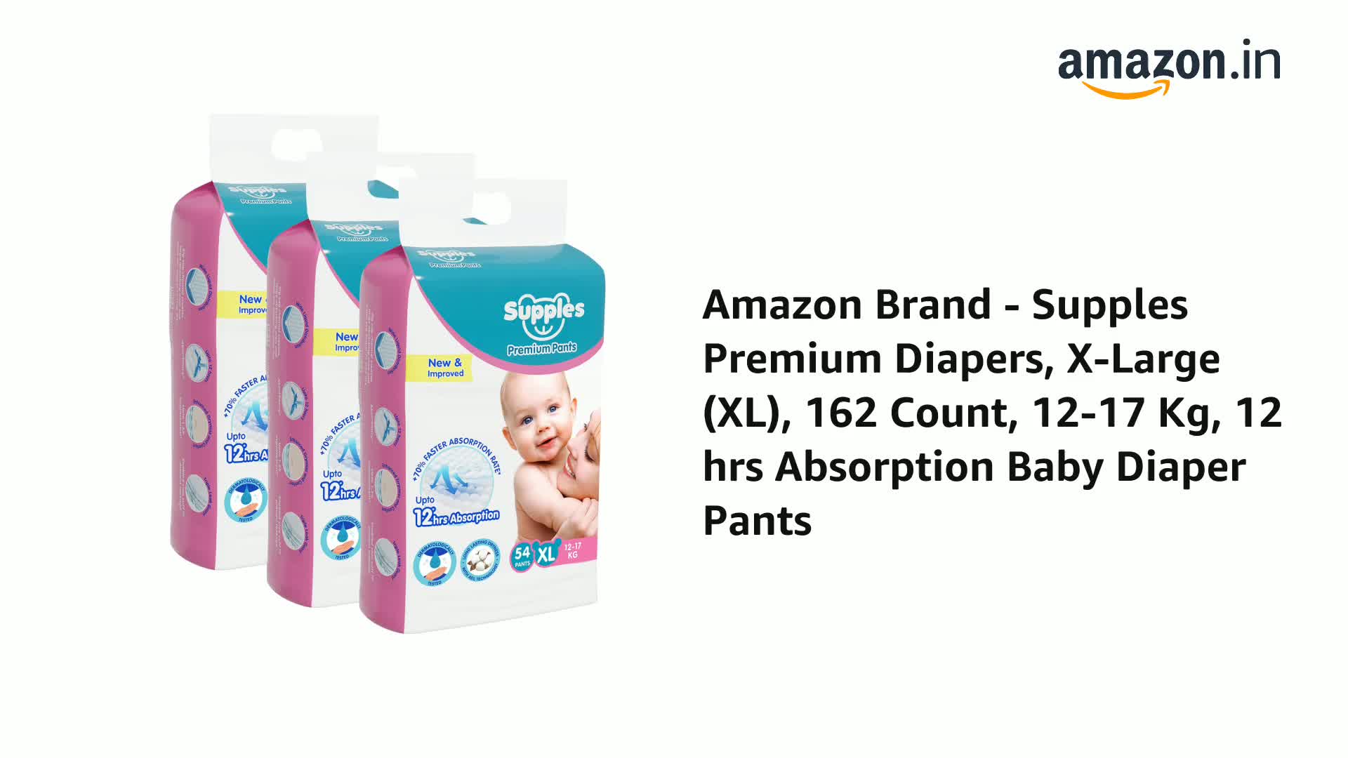 Amazon Brand - Supples Premium Baby Diaper Pants | 162 Baby Diapers | XL | 12-17 Kg | 54 x 3 Packs | 12 Hrs Absorption | Cushiony Cotton Soft Fabric | Phthalates-Free | Triple Leak Guard