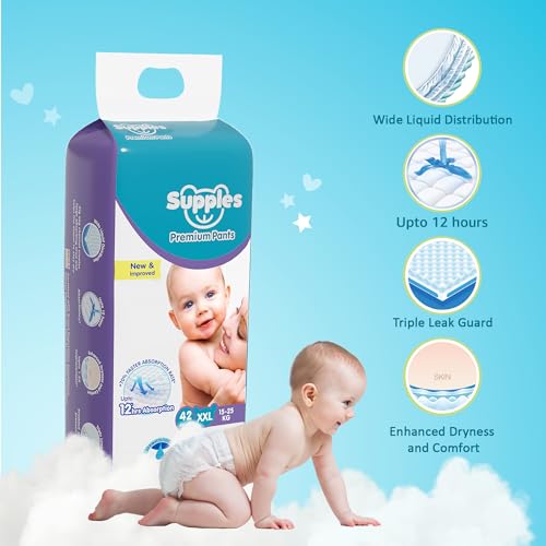 Amazon Brand - Supples Premium Baby Diaper Pants | 42 Baby Diapers | XXL | 15-25 Kg | 12 Hrs Absorption | Cushiony Cotton Soft Fabric | Phthalates-Free | Triple Leak Guard