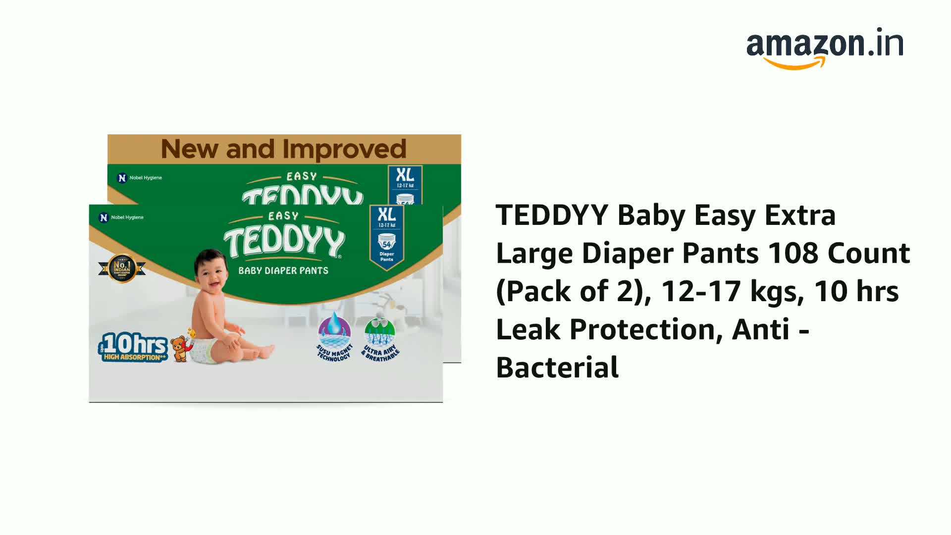 TEDDYY Baby Easy Extra Large Diaper Pants 108 Count (Pack of 2), 12-17 kgs, 12 hrs Leak Protection, Anti - Bacterial