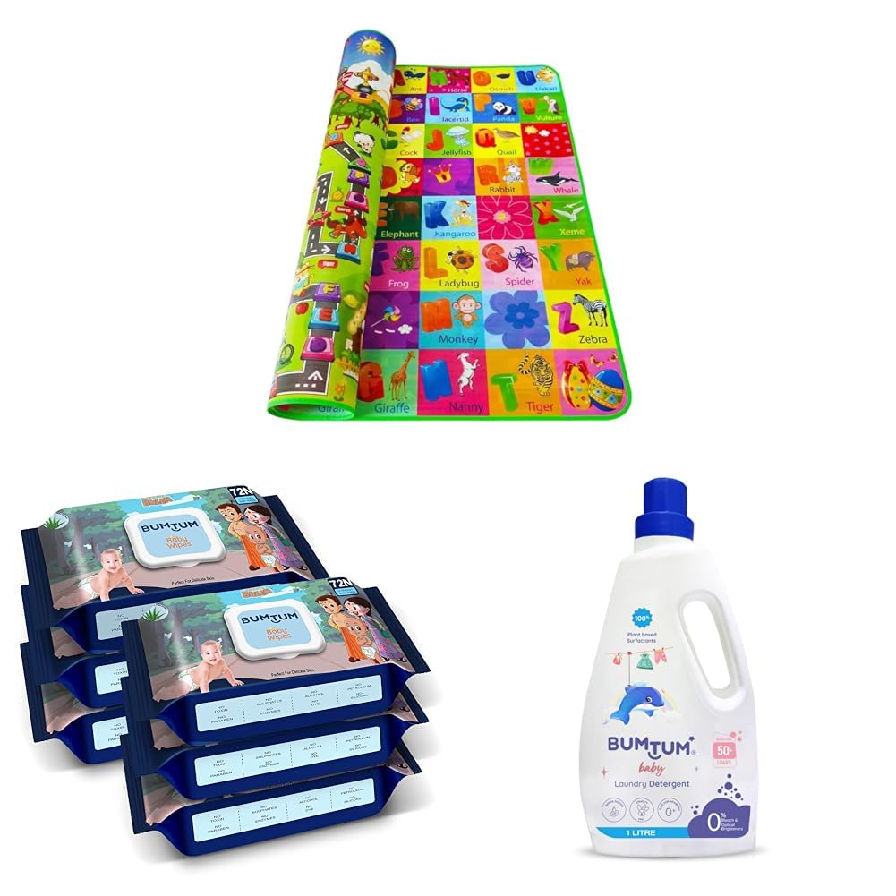 BUMTUM Double Sided Water Proof Baby Play Mat (Large Size, Multicolour) & Baby Chota Bheem Gentle Soft Moisturizing Wet Wipes (Pack of 6, 72 Pcs. Per Pack) & Baby Liquid Laundry Detergent 1 Litre,