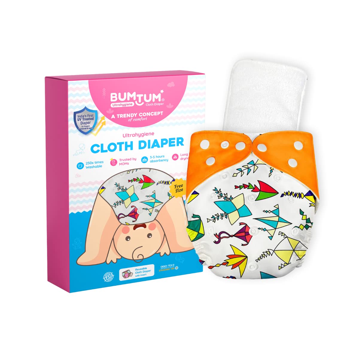 HomeBabyDiaperingCloth DiapersBumtum Cloth Diapers for Babies 0 to 3 Years | Pack of 1 with Inserts | Reusable Diaper for New Born Baby, Cloth Diapers, 5hrs Absorbency, Freesize, Washable, Cotton, Extra Soft (White Orange Kite)