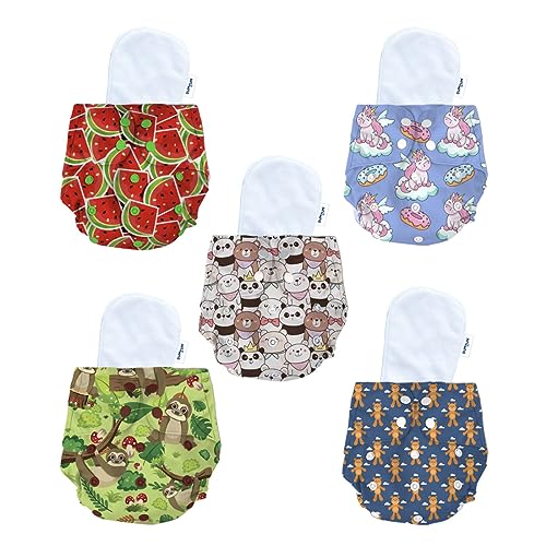 Bumtum Baby Diaper | 0-3 Yrs Baby Freesize | Pack of 5, New Born Baby Diaper, Cloth Diaper, Waterproof Reusable Diaper, Washable, Cotton, Extra Soft (Teddy, Unicorn, Teddy Face, Sloth & Watermelon)