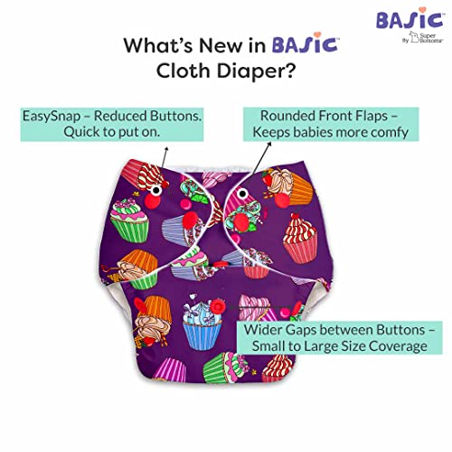 SuperBottoms BASIC Cloth Diaper For Baby | Washable & Reusable Cotton Cloth Diaper | 0-3 Years | Freesize | Adjustable | Reduces Rash | With 2 Quick Dry Pad/Insert | Cupcake |