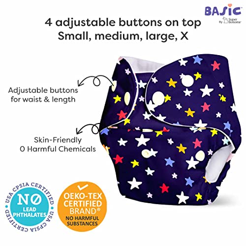 HomeBabyDiaperingCloth DiapersSuperBottoms BASIC Pack of 4 Freesize Adjustable, Washable and Reusable Cloth Diaper for babies 0-3 Years | One Size Adjustable Diapers (Pack of 4 diapers+ 4 inserts) Assorted prints
