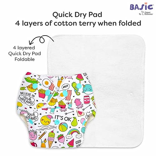 SuperBottoms BASIC Reusable Cloth Diaper with NEW Quick Dry UltraThin pads | 100% cloth Freesize, washable Diapers for baby 0-3 Yrs |Stay Dry & Lasts up to 3Hrs | Trim Fitting, Dries 2times faster