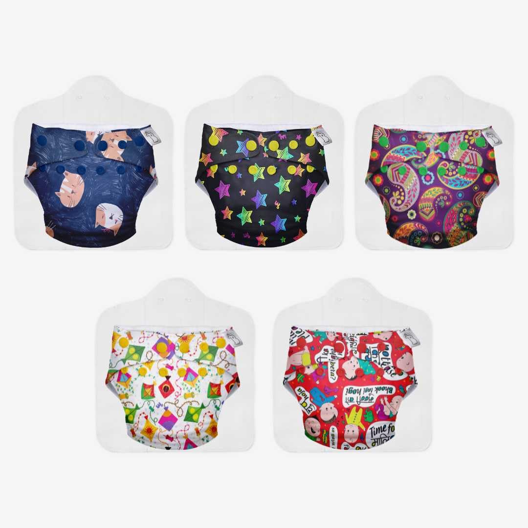 SuperBottoms Cloth Diapers for babies - Cloth Diaper Combo Pack of 5 Freesize UNO- New Version| Reusable Cloth Diapers for babies 3M to 3Y | With 5 organic cotton inserts/pads