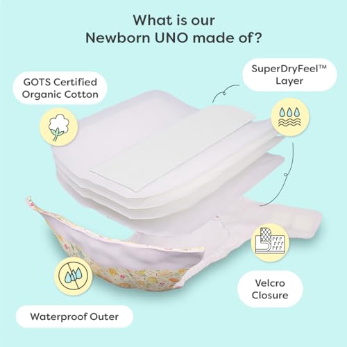 SuperBottoms Newborn UNO Premium Cloth Diaper with Insert (0 to 3m) | Washable & Reusable Diaper with Organic Cotton Pad | Superior Absorption | Waterproof | SuperDryFeel™ Layer | Super Soft & Gentle