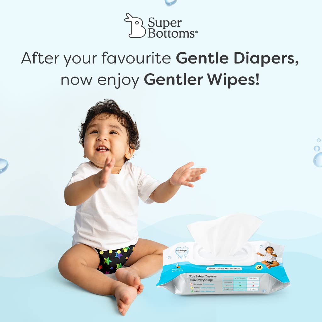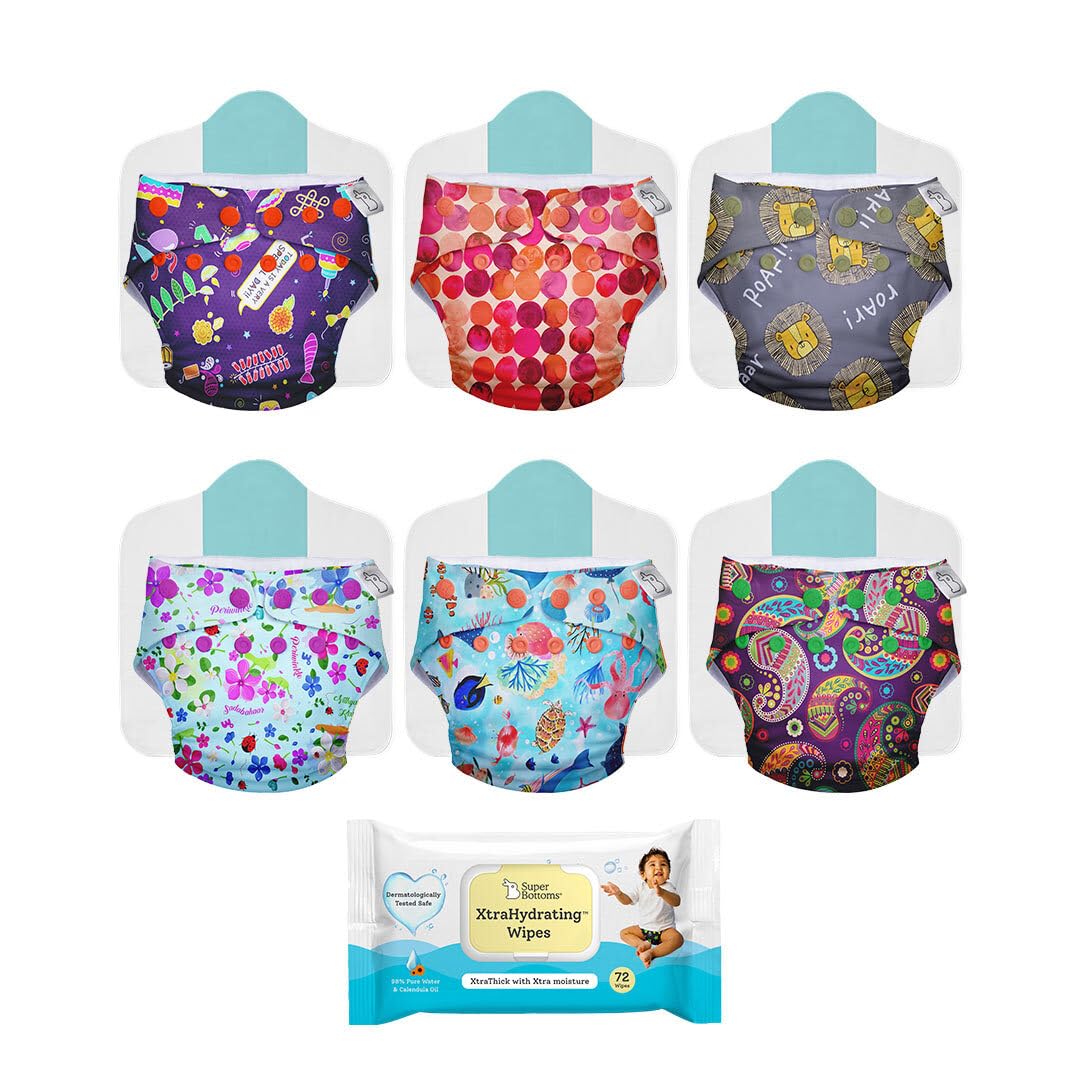 SuperBottoms UNO 6 Cloth Diapers with XtraHydrating Wipes-72 Pack- |3x Thicker Premium Wet wipes | 98% Pure Water 3.5x moisture | Freesize Reusable diaper - 5-17kgs| 6 Dry Feel Pad - 13Pcs Pack