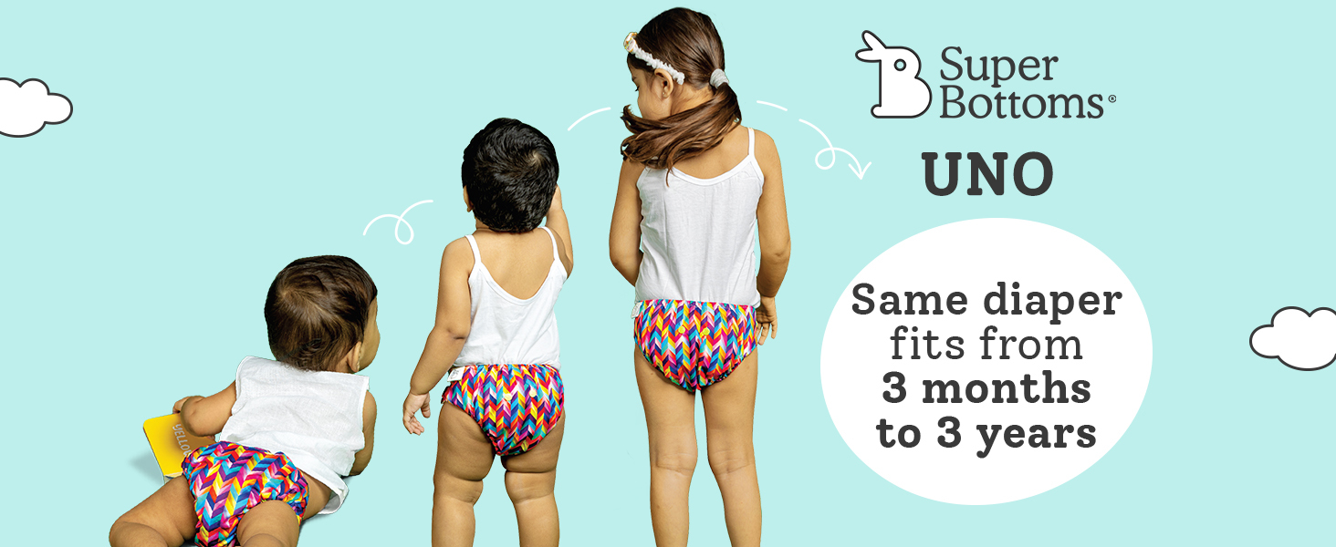 Say hello to the ULTIMATE SuperBottoms UNO Cloth Diaper - your 300+ times Reusable and Washable Cloth Diaper solution. This freesize adjustable diaper fits babies aged 3 months to 3 years (7kg-17 kg) i.e. covers small (S zize) to large size (L size) and i