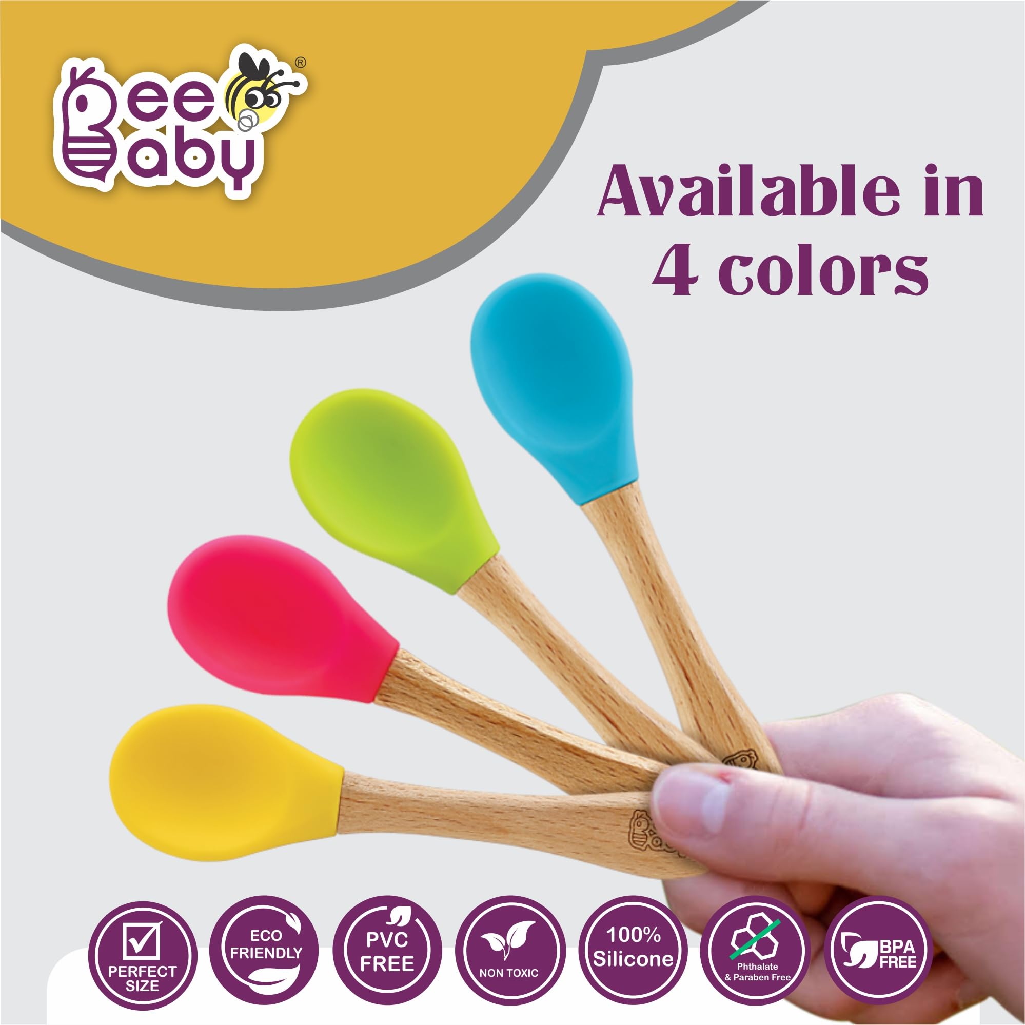 BeeBaby Nurture Bambu Wooden and Silicone Baby Feeding Spoons. 100% BPA Free Silicone Tip Weaning Spoons for Kids & Toddlers. Food Grade Infant & Environmental Safe 6 Months+ (Nurture - Blue_Green)