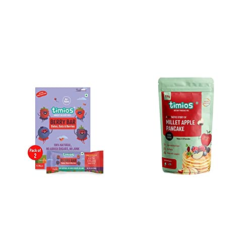 Timios Berry Bar Healthy Snack Natural Energy Food Product Ready to Eat for Toddlers - 4+ Years (Pack of 8) & Timios Organic No Maida Millet Pancake Mix-Apple with Cocoa,150gm