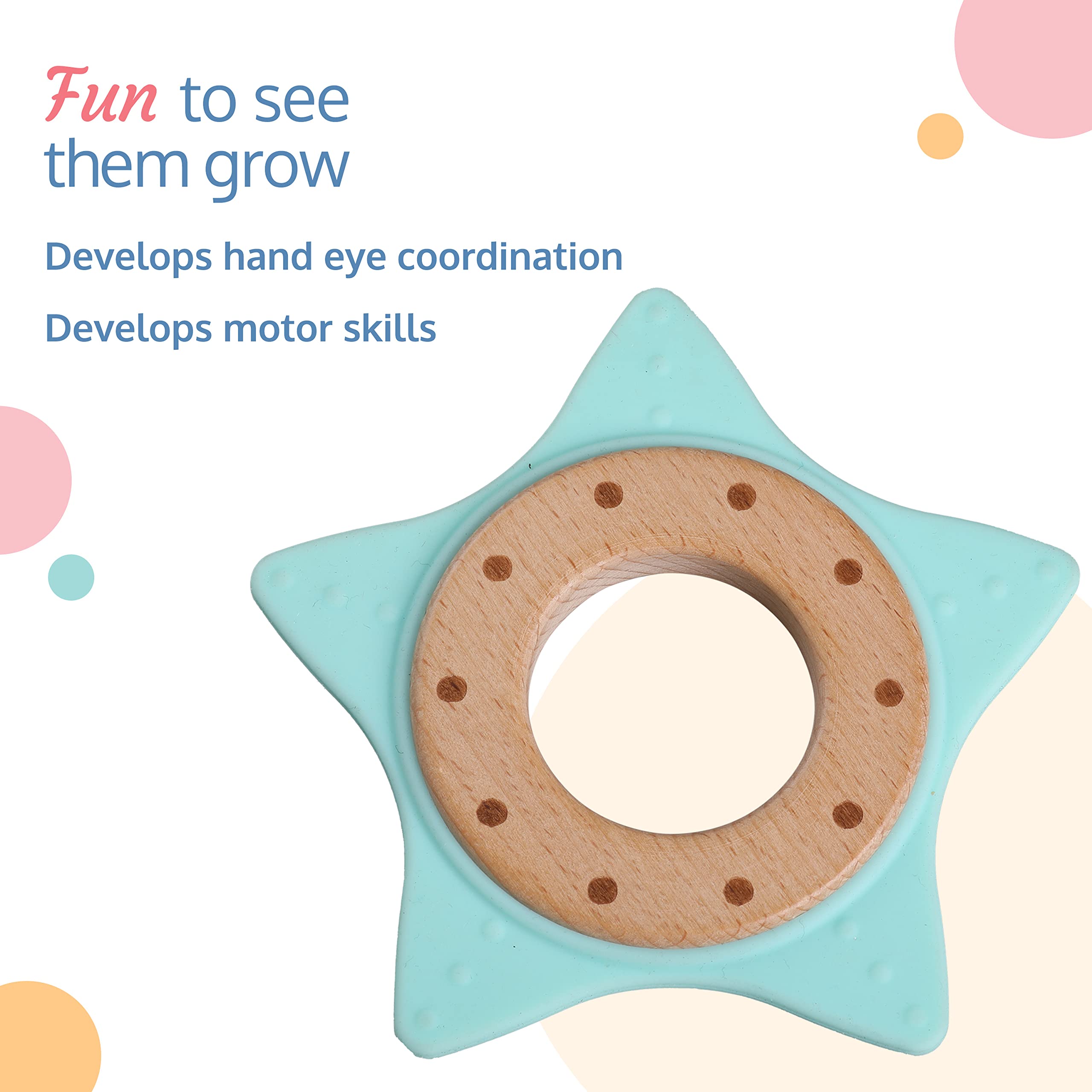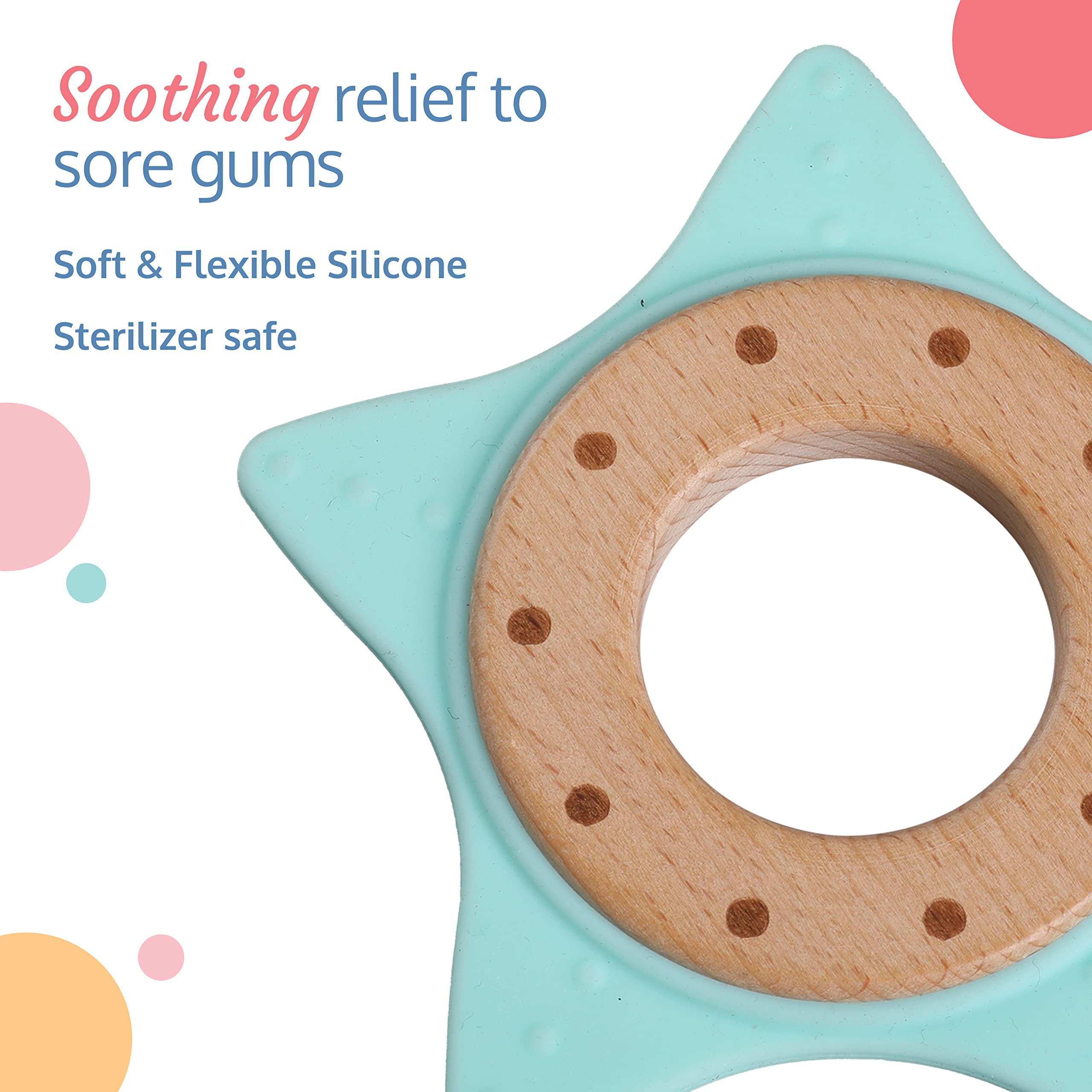 LuvLap Baby Silicone Lightweight Teether with Natural Beech Wood Inner Ring for Infant 100% Food Grade Silicone Easy Grip 3 Months+ (Light Green)