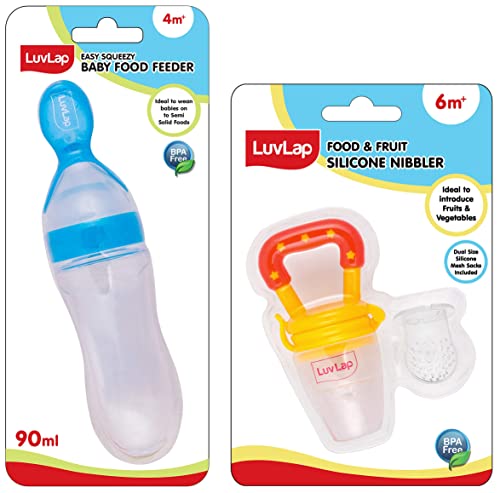 LuvLap Silicone Food/Fruit Nibbler with Extra Mesh, Soft Pacifier/Feeder, Teether for Infant Baby Feeding Spoon with Squeezy Food Grade Silicone Feeder Bottle 90Ml