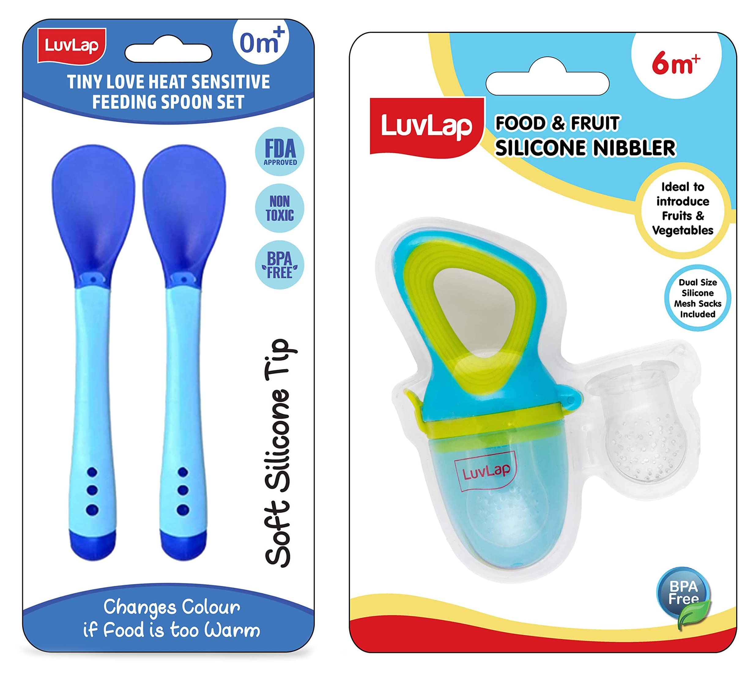 Luvlap Silicone Food/Fruit Nibbler with Extra Mesh, Soft Pacifier/Feeder, Teether for Infant Baby, Infant, Elegant Blue, Bpa Free & Tiny Love Heat Sensitive Baby Feeding Spoons Set, 2 Pcs, Blue