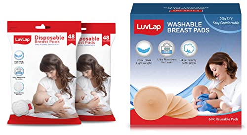 LuvLap Ultra Thin Honeycomb Nursing Breast Pads, 96pcs, Disposable, High Absorbent, Discreet Fit & LuvLap Washable Maternity Nursing Breast Pads, 6 Pcs, Reusable, Leak-Proof
