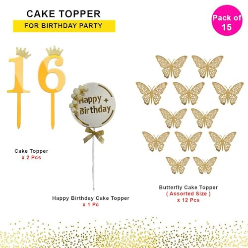 HomeBabyParty SuppliesPop The Party 16th Birthday Cake Decorations Gold Supplies Big Set With Black Happy Birthday Cake Topper, 12 Butterfly Cake Topper And Cake Topper (16 NUMBER)
