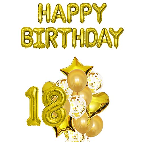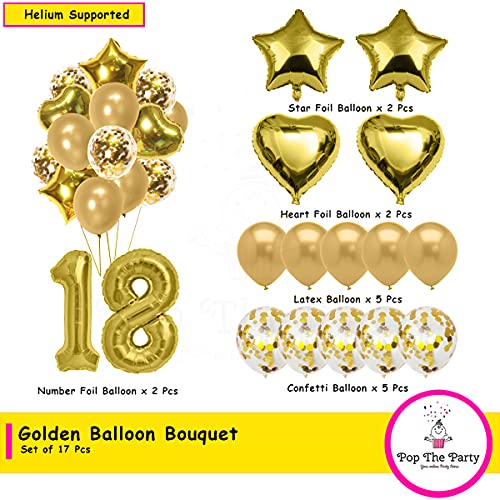 HomeBabyParty SuppliesPop The Party 18th Birthday Party Decorations Gold Supplies Big Set With Happy Birthday Balloons Banner and 18 Digit Balloon for Including Latex, star, heart and Confetti Balloons