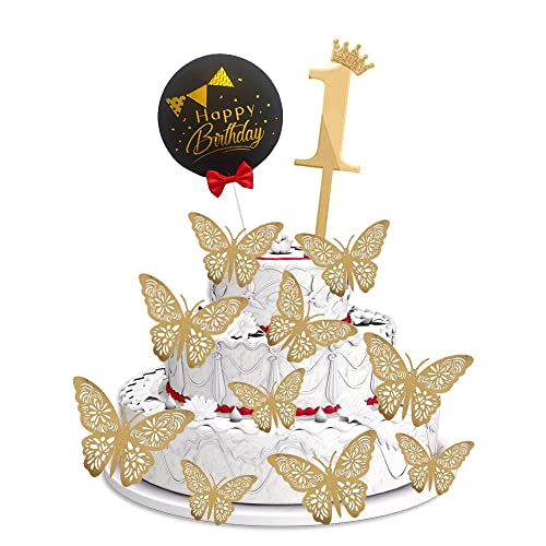 HomeBabyParty SuppliesPop The Party 1st Birthday Cake Decorations Gold Supplies Big Set with Black Happy Birthday Cake Topper, 12 Butterfly Cake Topper and 16 Digit Cake Topper