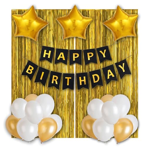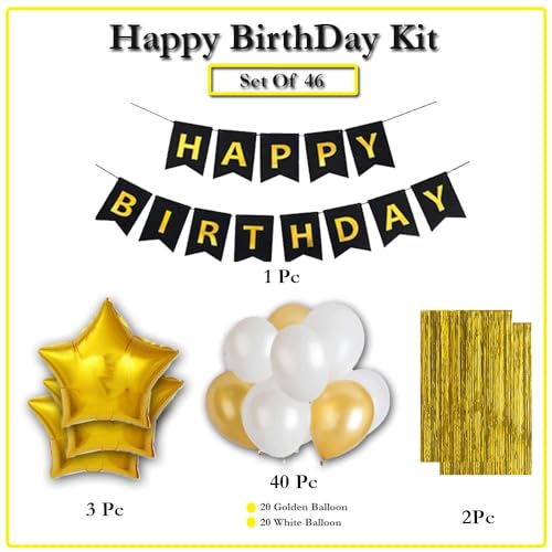 This Package Includes : 1Pc Black Happy Birthday Banner 2 Pcs Golden Metallic Curtains 3 Star Shape Foil Balloons 40 Metallic Balloons - 20 Golden Balloons 20 White Balloons For Decoration
