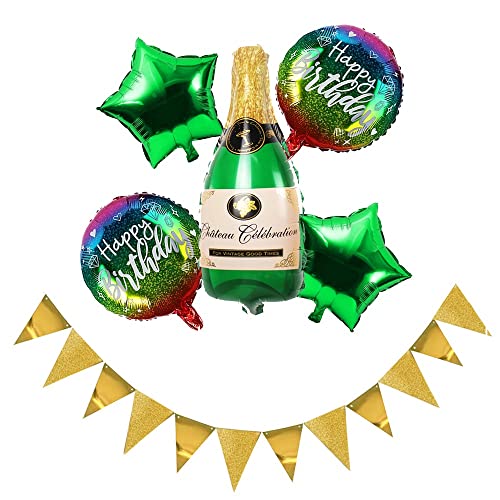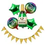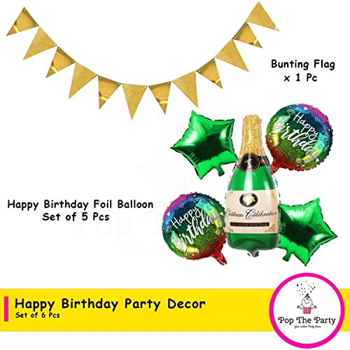 Pop The Party 6 pcs Green Chempagne Bottle Set, Star, Round Foil Balloon and Gold Bundting Balloon for Birtdhay Party Decoration