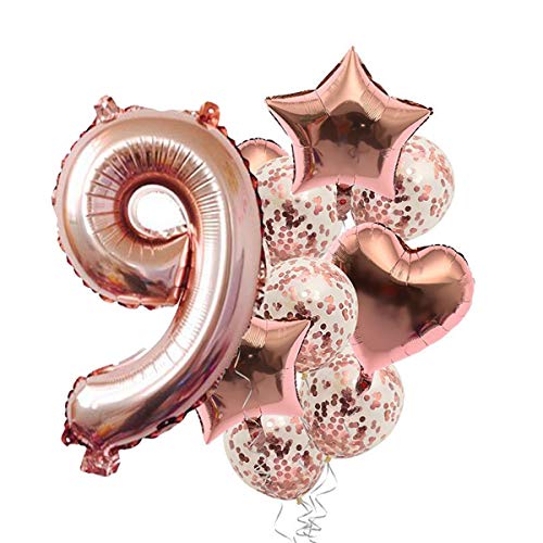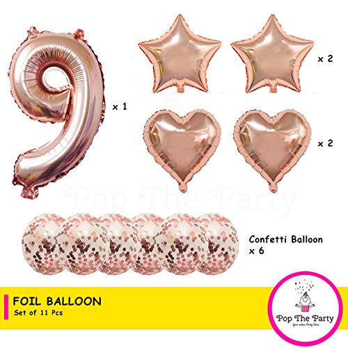 Pop The Party Nylon 9Th Number Balloon With 9 Digit Balloon For Including Star, Heart And Confetti Balloons,Multicolor,14 Pcs