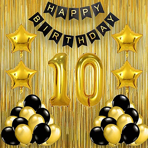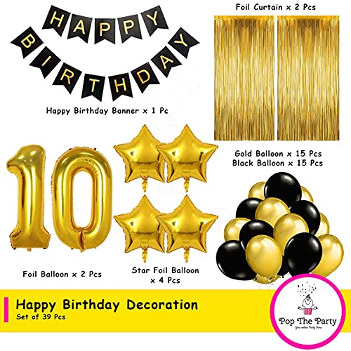 HomeBabyParty SuppliesPop The Party Black Gold 10th Birthday Party Decorations with Birthday Banner, Star, Latex Balloons, Curtains and 10 Digit No. Set of 39 Supplies (10th Birthday Party Decoration Gold)