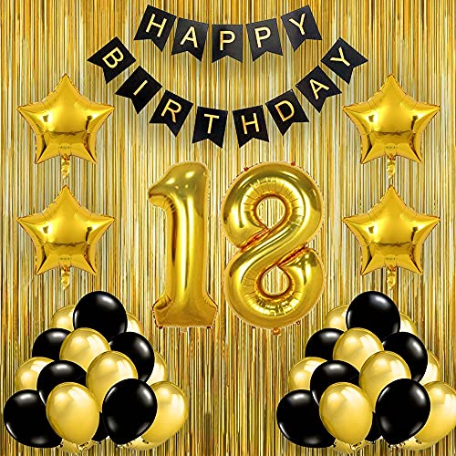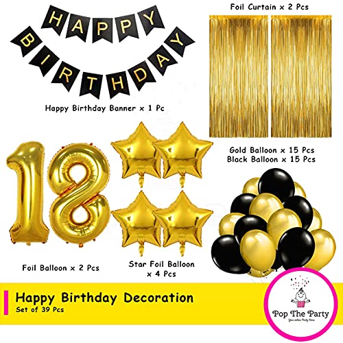 HomeBabyParty SuppliesPop The Party Black Gold 18th Birthday Party Decorations with Birthday Banner, Star, Latex Balloons, Curtains and 18 Digit No. Set of 39 Supplies (18thBirthday Party Decoration Gold)